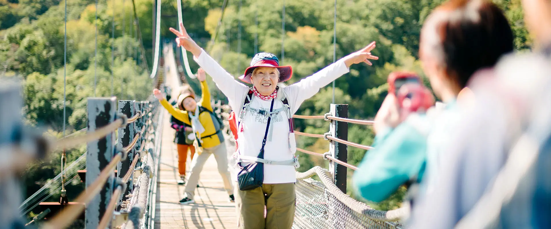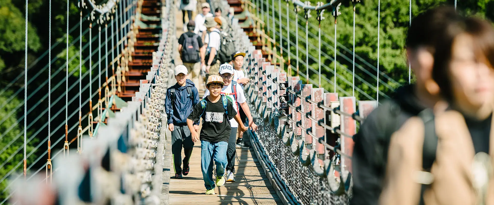 こころまち つくろう フォトギャラリー 一覧へ 吊り橋を渡ろう! 残暑が過ぎ去り、ほしだ園地の森の木々がようやく色づく準備を始める頃。展望デッキから眺める景色も夏から秋へ、紅葉シーズンが待ち遠しいね! 吊り橋を渡ろう! ハイキングクラブの仲間と一緒に園地内の自然を楽しんでいます、という皆さん。巨大吊り橋「星のブランコ」からの絶景に感動もひとしおのようです。 吊り橋を渡ろう! 森林の上を渡る橋は緑の中に吸い込まれてしまいそうなほどスリル満点!爽快感たっぷりの大パノラマに足取りも軽快になりますね。 Back 2025.09.30 Tweet