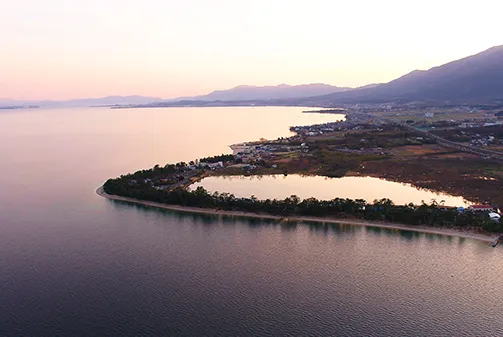 「近江舞子プロジェクト」を進めている12haの保有地は、約50年前に京阪電気鉄道㈱が取得したもの。ほとんど手つかずだった自然をできる限りそのまま活かすため、「エバーグレイズ琵琶湖」の開発に先立ち、約2年をかけて自然環境調査を丁寧に行いました。着工後も地元住民の方々に協力を仰ぎ、近江舞子の本来の自然の形に沿うように造成、整備を実施し、人も自然の一部となって溶け合うようなアウトドアリゾートが完成。目の前に琵琶湖、背に比良山系を構える、雄大な自然の魅力を肌身で感じることができる施設として、お客さまにも地元の皆さまにもご好評いただいています。