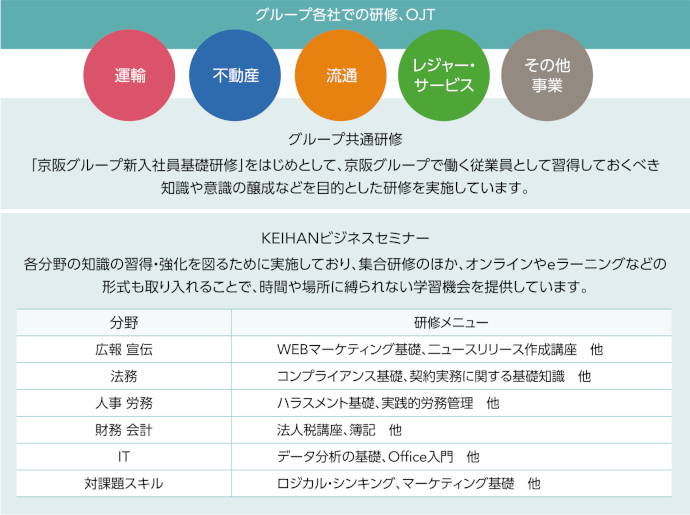 京阪グループでは、グループ各社における研修やOJTによる教育に加え、京阪グループで働く従業員として習得しておくべき知識や意識の醸成などを目的として、入社時に「京阪グループ新入社員基礎研修」を開催しています。また、問題解決力や論理的思考力、部下指導力などのビジネススキルや、財務・会計、労務、コンプライアンスなどの各種知識の習得・強化を図るため、KEIHANビジネスセミナーにおいて各種研修・自己啓発メニューを提供し、グループ全体の教育を推進するとともに社員の自律的な能力開発を支援しています。