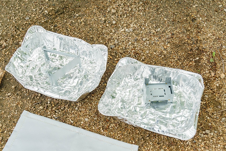 BBQをしにきたんです。BBQコンロを準備していくということで、ポケットストーブやコンパクト薪ストーブなどをコンロとして用意。アルミプレートは急きょ本来の用途を失った焚き火シートの代わりに使用していきます。