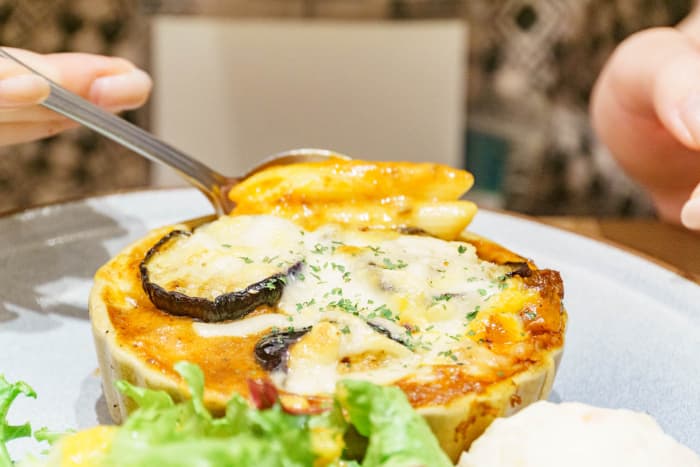 お枚の方が食べたグリルなすのミートソースグラタンプレート。トロトロのナスにトロトロのチーズがからんで、濃厚なミートソースがめっちゃおいしいんだとか!