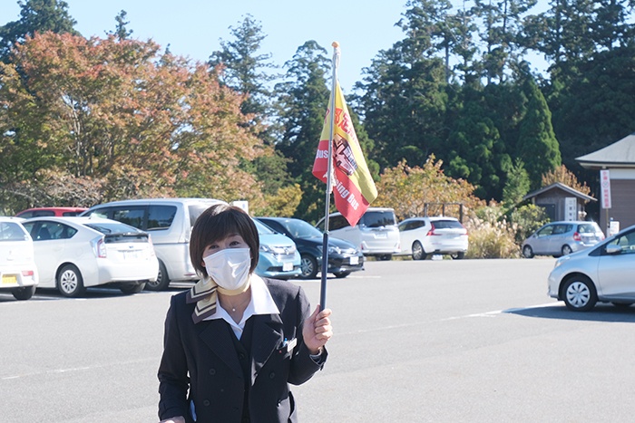 今回おすすめしたいのは京都定期観光バスのQコース「⼤原三千院と世界遺産⽐叡⼭延暦寺」。例年3月下旬から11月にかけて運行される定番コースです。出発は京都駅烏丸口。乗り場に着いたら検温と手指のアルコール消毒をして、さぁ出発!