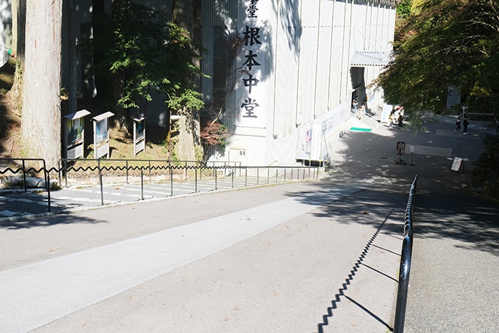 お堂が見えてきましたね!この前を通って総本堂にあたる根本中堂に向かいます。さて、現在、根本中堂は大改修中。2016年から始まってるねんけど、改修には約10年かかる予定。というわけで現在、外観はこんなふうになっています。