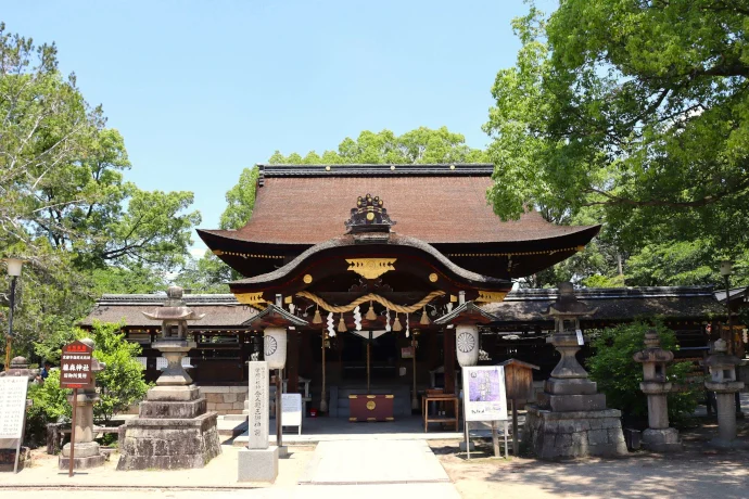 約1800年前、神功(じんぐう)皇后によって創建された古社。祭神は素盞嗚尊(すさのおのみこと)、神功皇后、舎人(とねり)親王など、武勇や国家の安泰に深く関わる神々がまつられています。