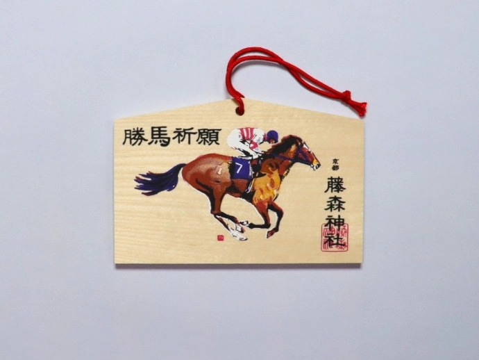 馬とジョッキーが描かれた絵馬で、新年の「勝利」を祈願。