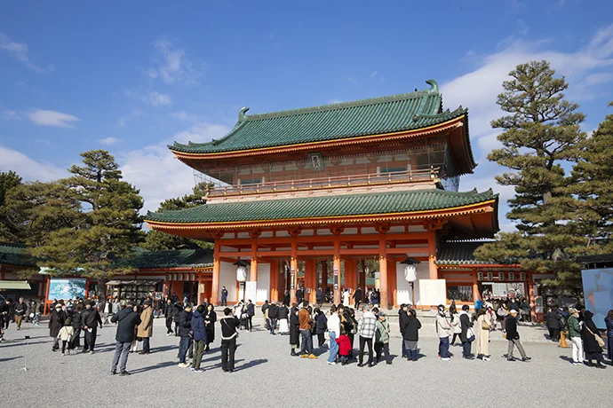 1895(明治28)年に平安遷都1100年を記念して創建。大みそかは夜通し開門され、境内すべての灯ろうに明かりがともり幻想的な雰囲気に。