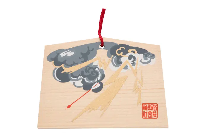 神代の時代に天上で雷鳴が轟き、丹塗矢(にぬりのや)が降ったとされる神話の一場面を描いた絵馬。〈500円〉
