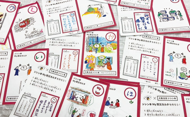 大阪市北区の防災本「ジシン本」のイラストが描かれた絵札に、塗り絵をしたり言葉を添えてオリジナルの防災カルタを作ろう!