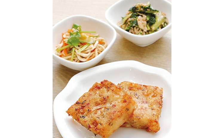 大根もち・干し豆腐中華和え・小松菜とエビなどのおばんざいは、約15種類から選べます。各150円から