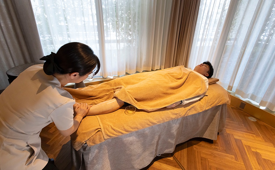 今回はひざ下と足裏をマッサージする「アロマテラピー・リフレクソロジー」(ひざ下・足裏、50分12,705円)を体験。メディカルグレードの精油を使用して足裏の反射区を刺激し、心身のバランスを整えていく。