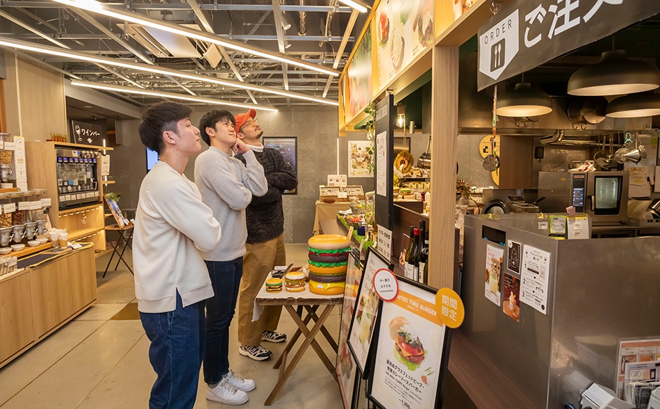 サステナブルな複合型商業施設「GOOD NATURE STATION」の館内を巡った3人が向かったのは、1階「MARKET」の中央に位置する「GOOD NATURE KITCHEN」。今年2月にリニューアルオープンしたこのお店では、「MARKET」で販売している農産物や食品を使い、素材の力を最大限に引き出したメニューを中心に提供しています。なかでも『GOOD LOCAL BURGER SERIES(グッド ローカル バーガー シリーズ)』は京都の味を手軽に味わえると大人気です。