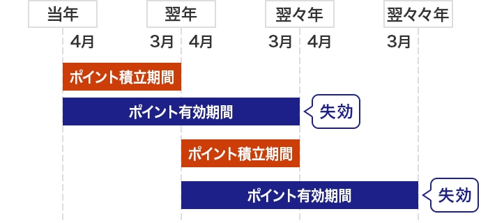 | 積立期間(ポイントがたまる期間) | 毎年4月1日〜翌年3月31日の1年間を「積立期間」とし、翌年4月1日から新たなポイント積立期間となります。 |