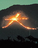 夜になると数多くの灯明を人形(ひとがた)文字「大」の形に点灯し、お精霊さんをお迎えします。