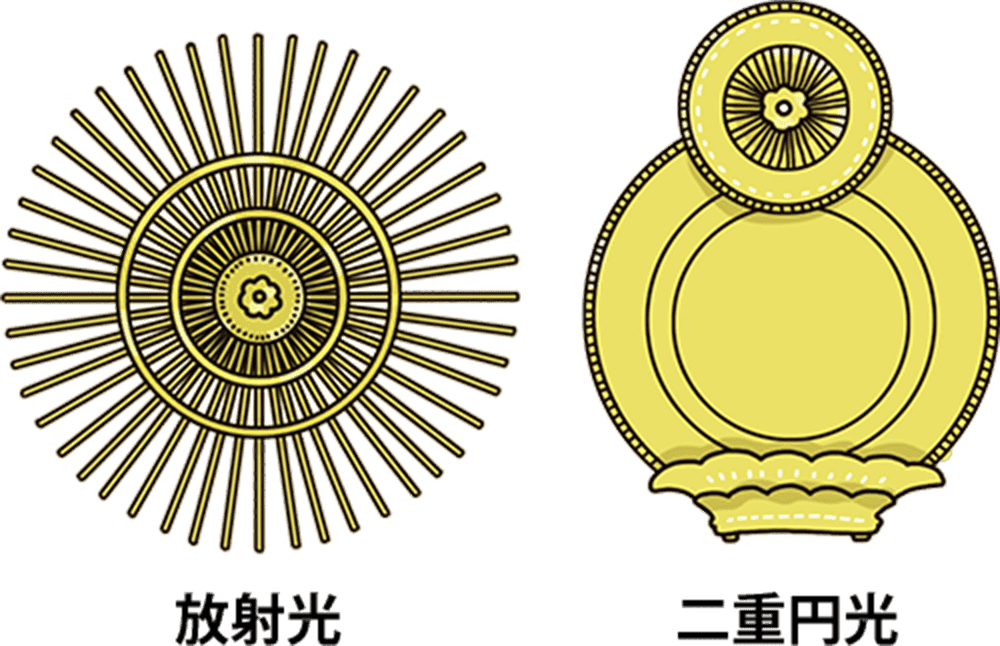 仏様は光の中にいるとされ、その光を形にしたものが光背です。頭の背後にある頭光(ずこう)と全身を覆う挙身光(きょしんこう)に分けられ、仏像の種類や造られた時代によって放射光や二重円光など様々な形があります。