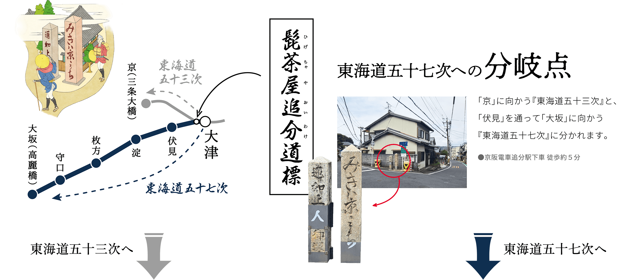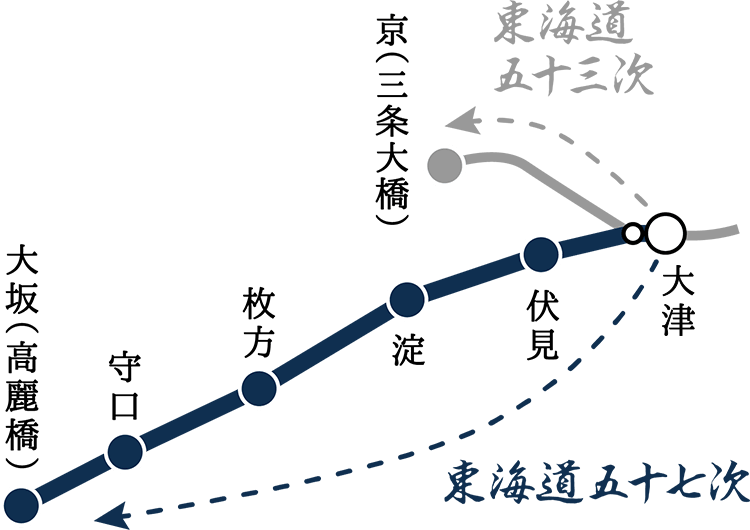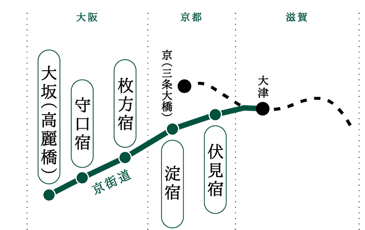 東海道といえば、歌川広重の浮世絵で有名な江戸・日本橋から京都・三条大橋までの「五十三次」ですが、実は「五十七次」でもありました。江戸幕府は西国に配した外様大名が参勤交代で朝廷と接触することを禁じていたため、東海道も洛中を通らない伏見へのう回路が必要となりました。そのルートの土台となったのが「京街道」。豊臣秀吉が淀川の堤防を改修したのち、その堤防上に開いた道です。そして、街道沿いには伏見・淀・枚方・守口の4つの宿場が整備され、東海道五十三次に加わり、東海道五十七次となりました。