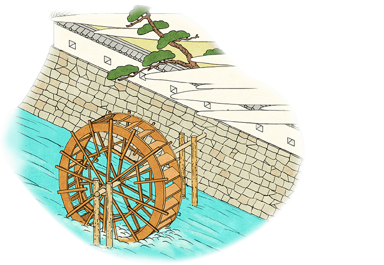 江戸時代、淀川から城内に水を引くために巨大な水車が回っていました。現在はその復元モニュメントが京阪電車淀駅前に設置されています。