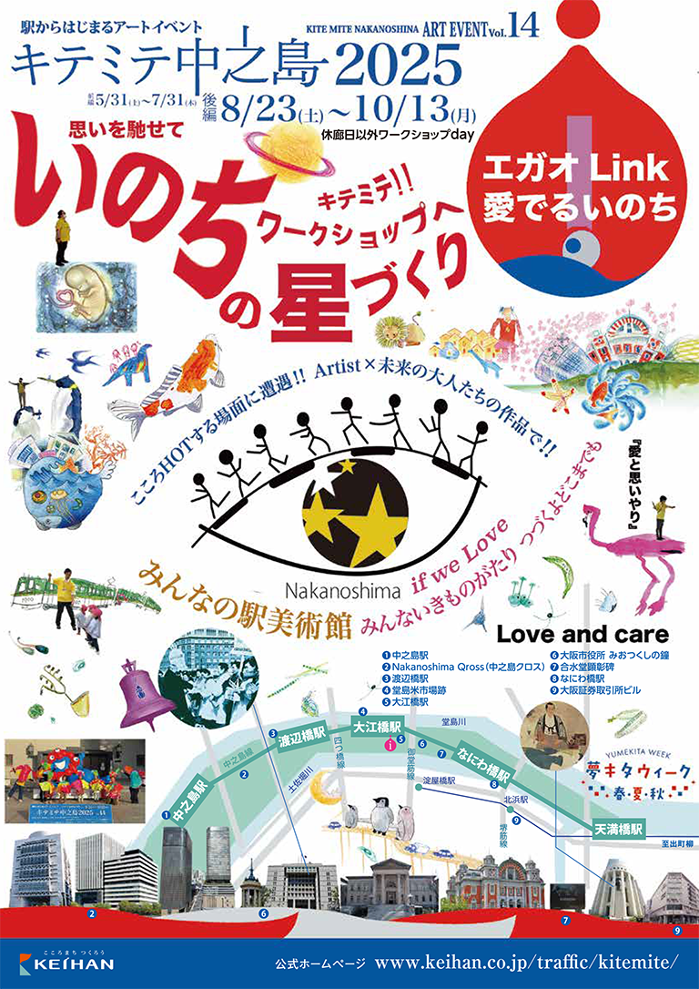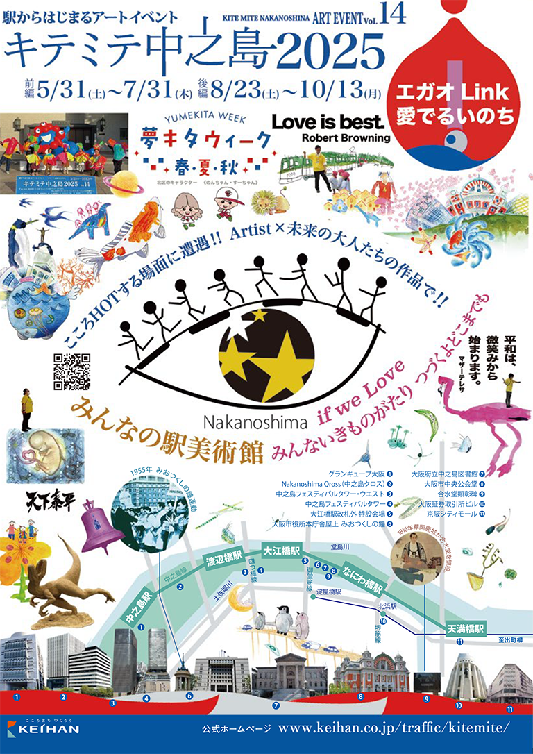 キテミテ中之島は、中之島を訪れた人たちに「中之島=文化・芸術の地」とあらためて感じていただくとともに、中之島の魅力を広く発信するというコンセプトのもと、2011年から開催して今年で14年目になります。中之島エリアの駅や施設に、アーティストや一般募集した作品の展覧会「みんなの駅美術館」を開催しています。