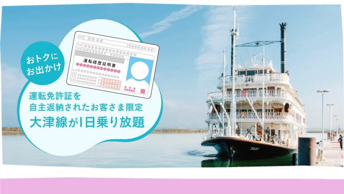 運転免許証を自主返納された方へ、おトクに鉄道でお出かけをお楽しみいただけるように、大津線が1日乗り放題のチケットをご用意しました。