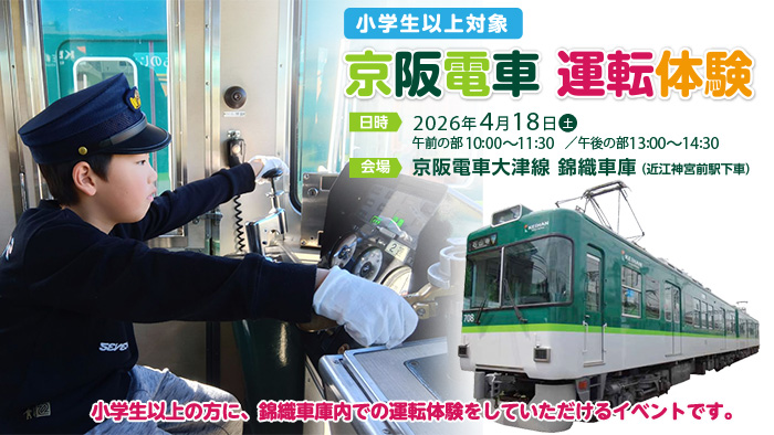 | 開催概要・参加申込について | 実施日 2026年4月18日(土) [午前の部・初心者枠]10:00~11:30 [午後の部・経験者枠]13:00~14:30 集合場所・集合時間 京阪電車大津線 錦織車庫入口臨時受付 (近江神宮前駅下車) [午前の部・初心者枠]9:30~9:45 [午後の部・経験者枠]12:30~12:45